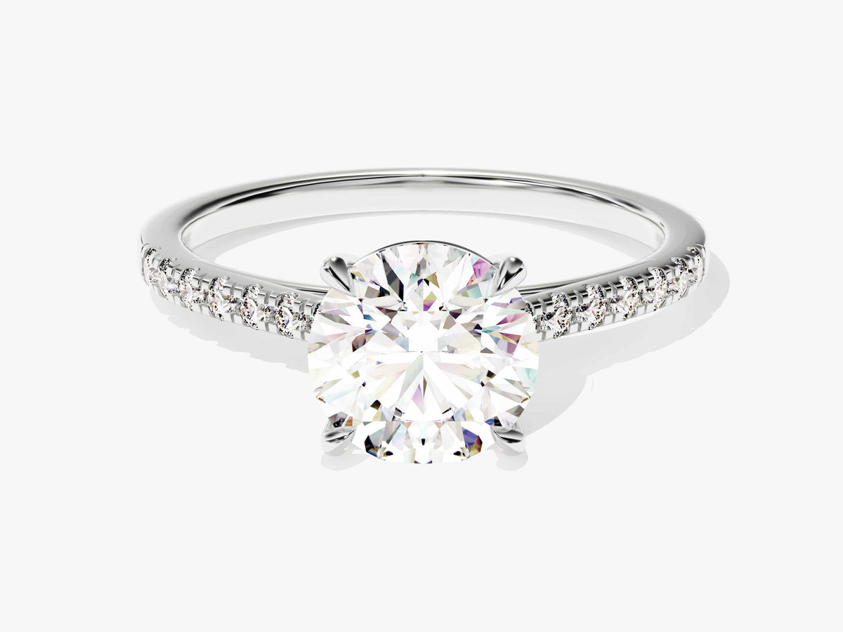Refined and dazzling, this moissanite engagement ring in 14k gold features 14 brilliant side stones on its band that complement your round center stone.