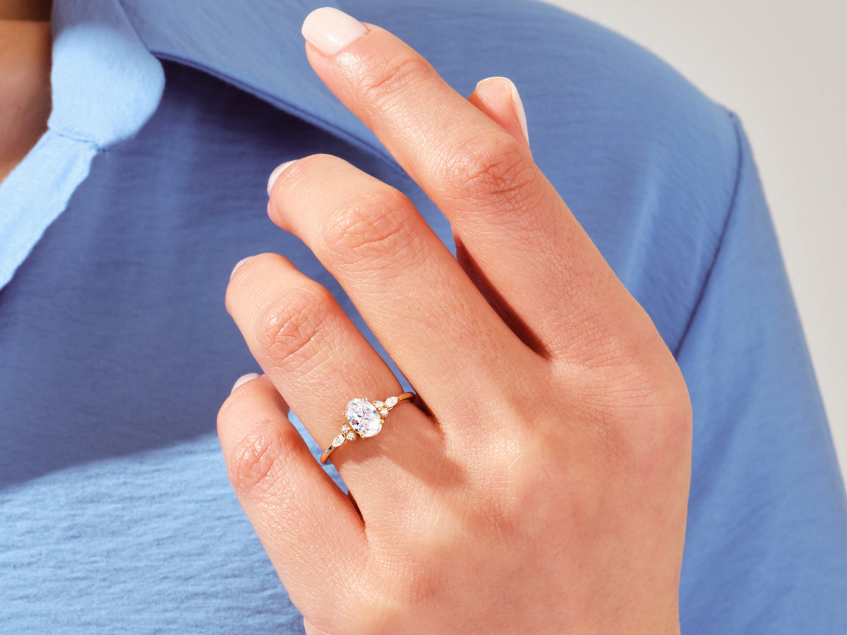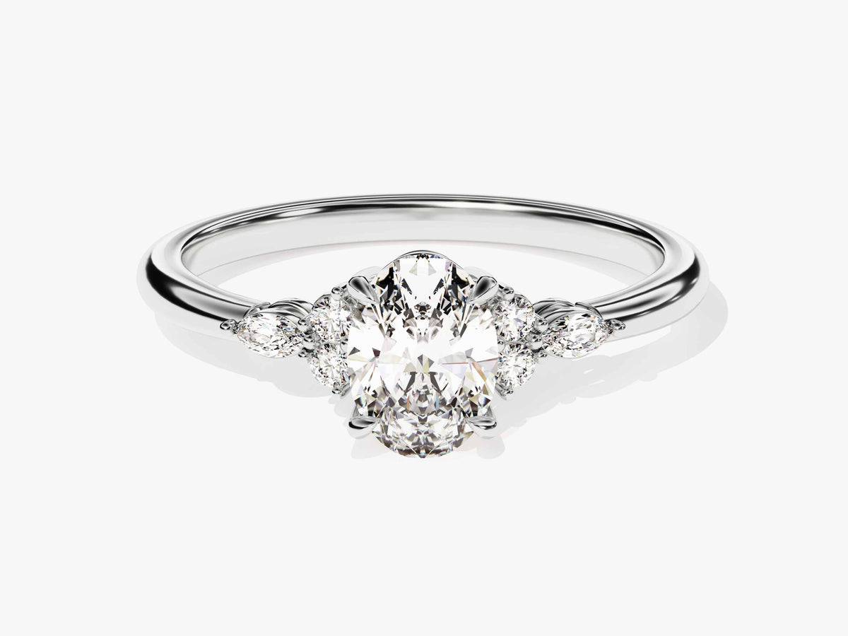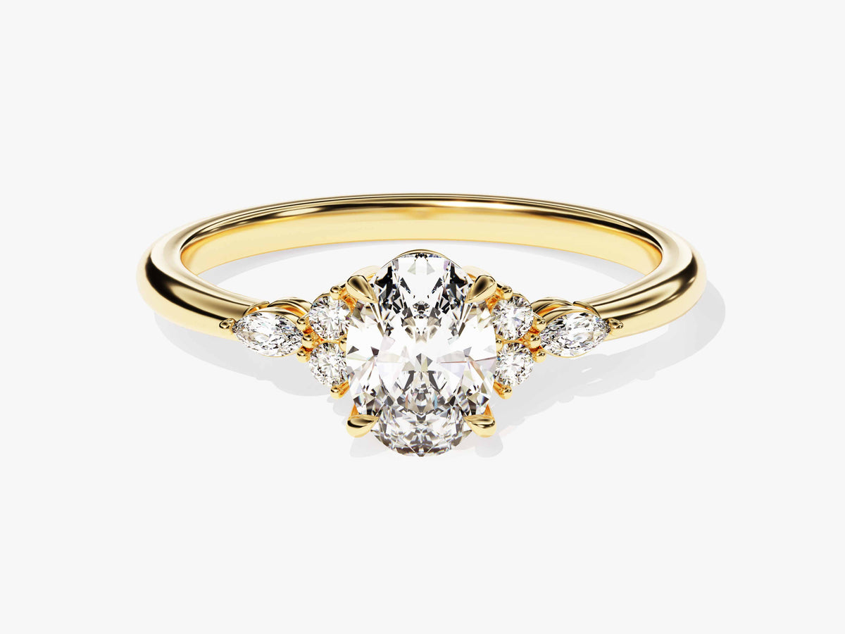 Beautiful and luring, this moissanite engagement ring in 14k gold features a cluster of 4 round and 2 marquise-shaped sparkling stones to complement your oval-shaped center stone.