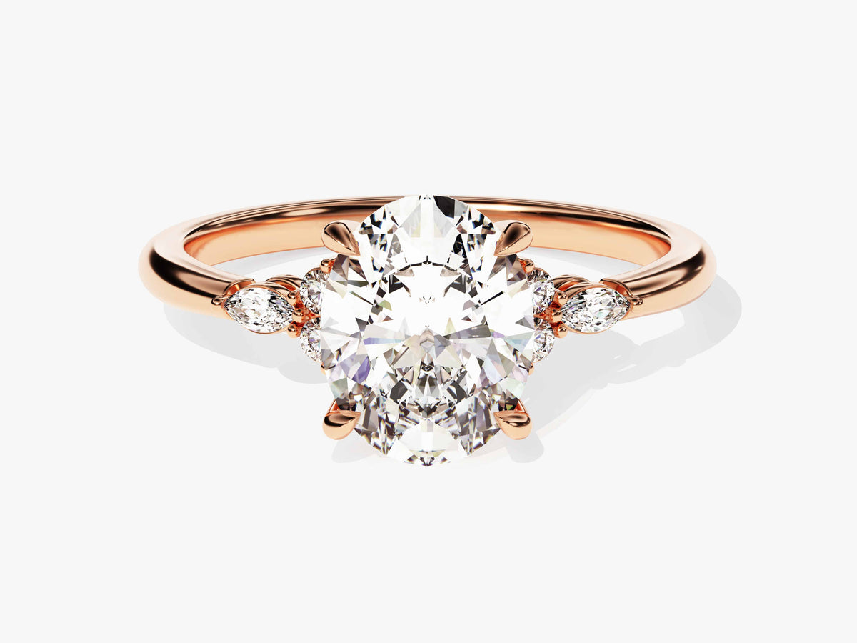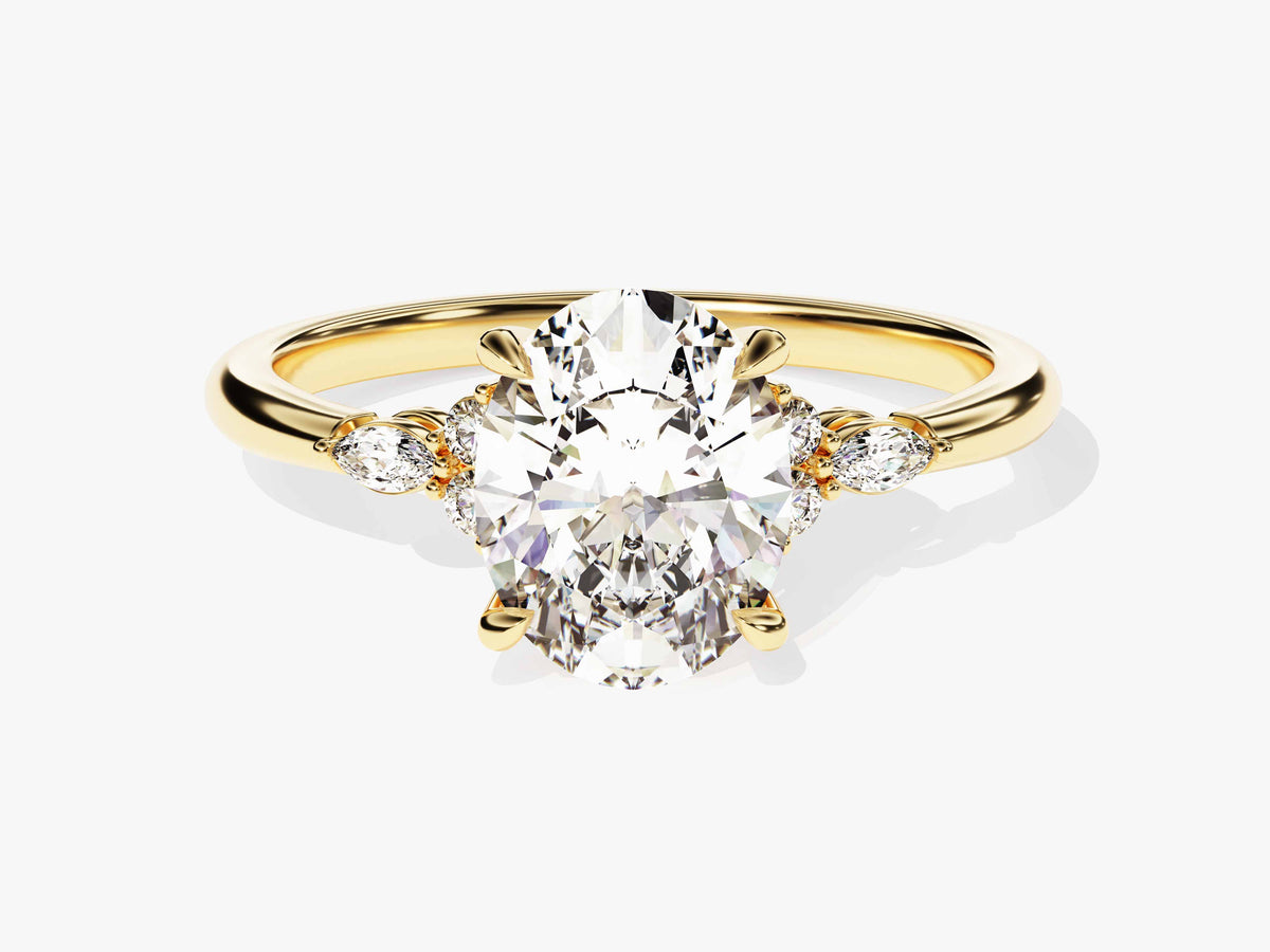 Beautiful and luring, this moissanite engagement ring in 14k gold features a cluster of 4 round and 2 marquise-shaped sparkling stones to complement your oval-shaped center stone.