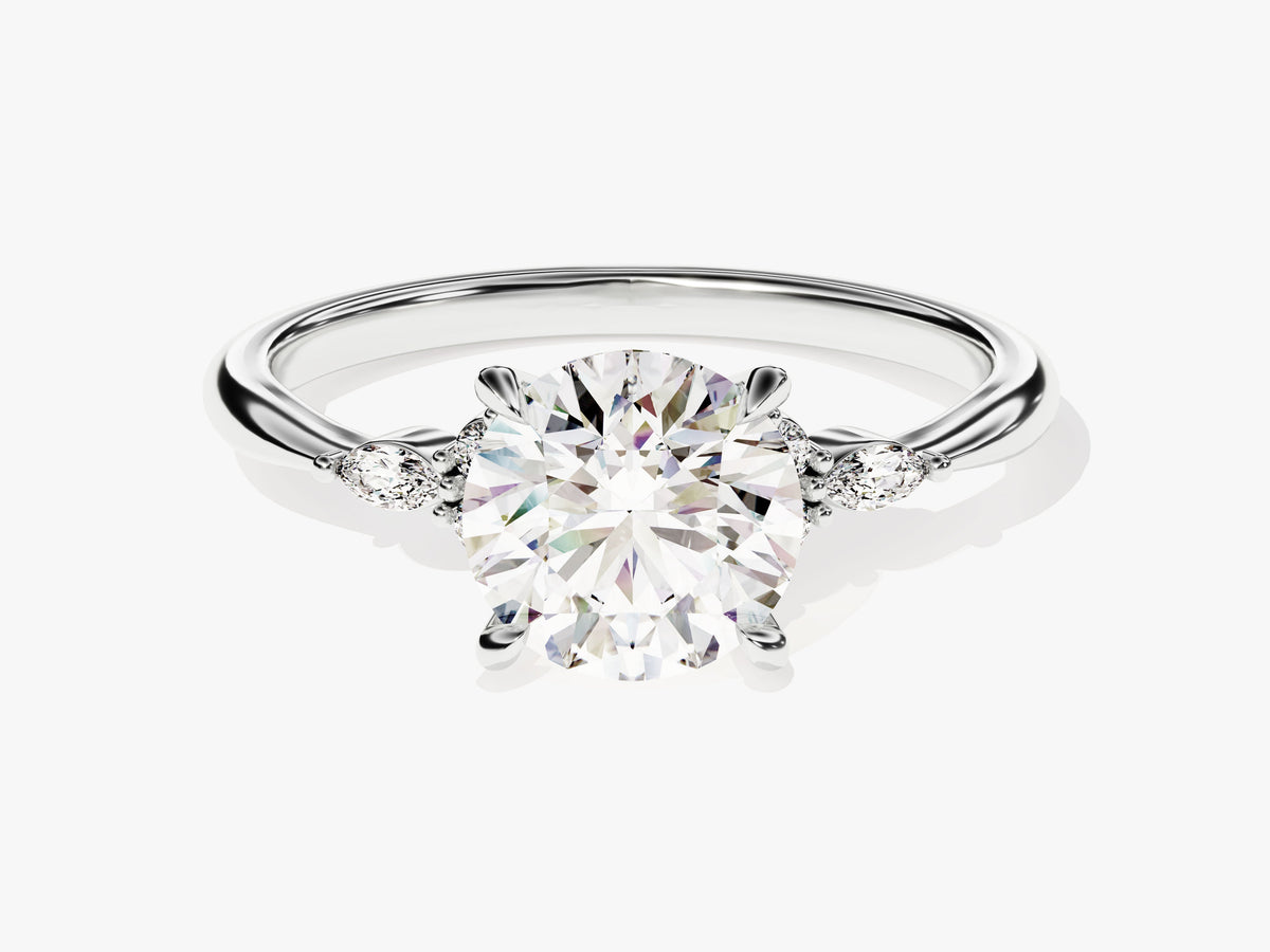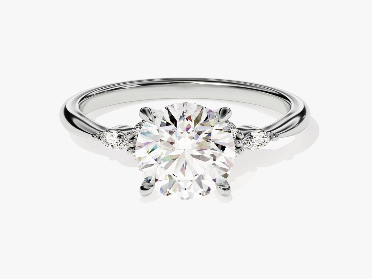 Glorious and radiant, this moissanite engagement ring in 14k gold features a cluster of 4 round and 2 marquise-shaped sparkling stones to complement your round center stone.