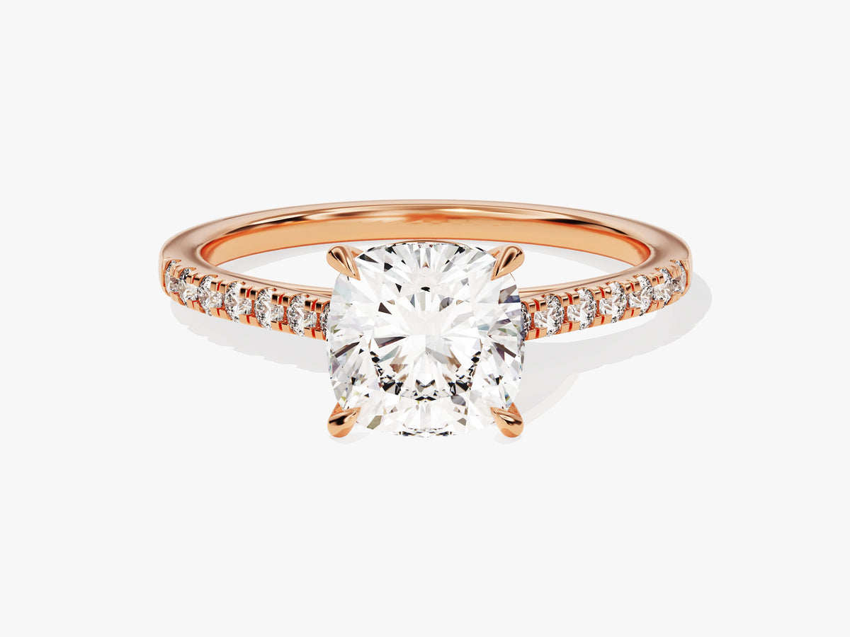 Declare your love with the unmatched sparkle of our Cushion Cut Moissanite Engagement Ring adorned with Pave Set Side Stones. This extraordinary ring features a stunning cushion-cut moissanite as its centerpiece, radiating brilliance and charm. The moissanite is beautifully accented by smaller stones, meticulously set in a pave style, enhancing the overall shimmer and allure.