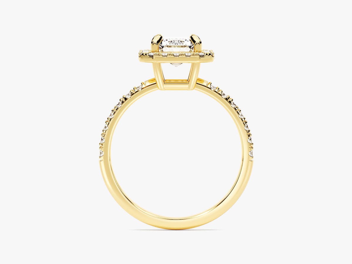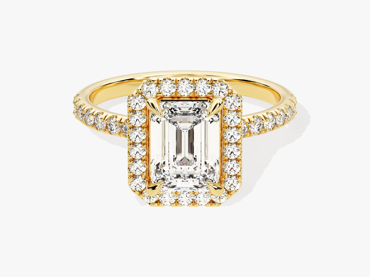 Elevate your proposal with elegance and brilliance using our Emerald Halo Moissanite Engagement Ring with Pave Set Side Stones. This remarkable ring features a breathtaking emerald-cut moissanite center stone, celebrated for its captivating brilliance and timeless charm. It is artfully framed by a halo of smaller moissanite stones, meticulously set in a pave style, creating a dazzling display of shimmer and opulence.