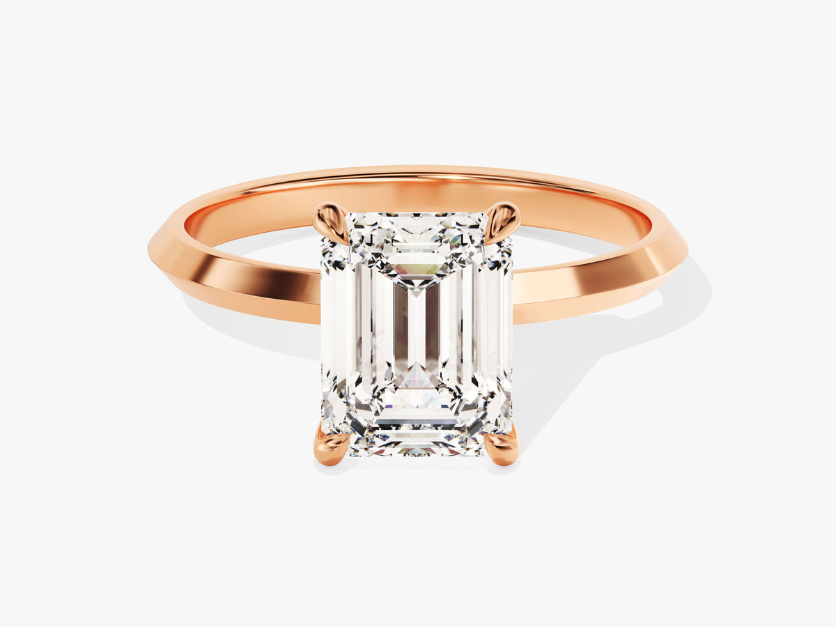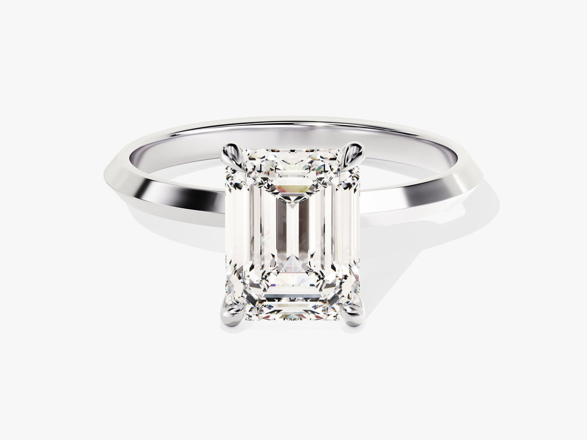 Experience the grace in simplicity with our Knife Edge Emerald Moissanite Engagement Ring. At its core is a captivating emerald-cut moissanite, known for its exquisite charm and timeless allure. The spotlight is on the knife-edge band, a unique feature that symbolizes the distinctive nature of your commitment.