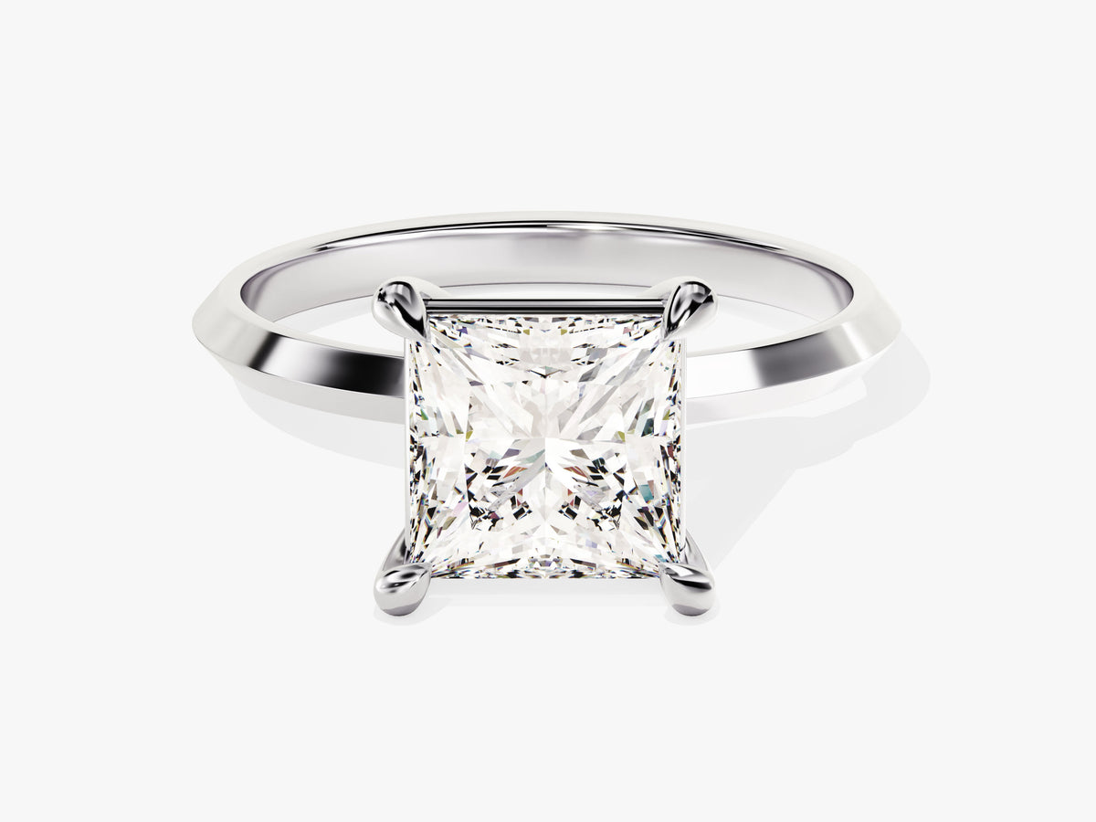 Experience the effortless chic with our Knife Edge Princess Moissanite Engagement Ring. At its heart is a captivating princess-cut moissanite known for its exquisite charm and brilliant sparkle. However, the ring's true beauty lies in its knife-edge band, a unique feature that symbolizes the distinctive nature of your commitment. The band narrows to a delicate point beneath the central moissanite, adding a touch of simplicity to the overall design.