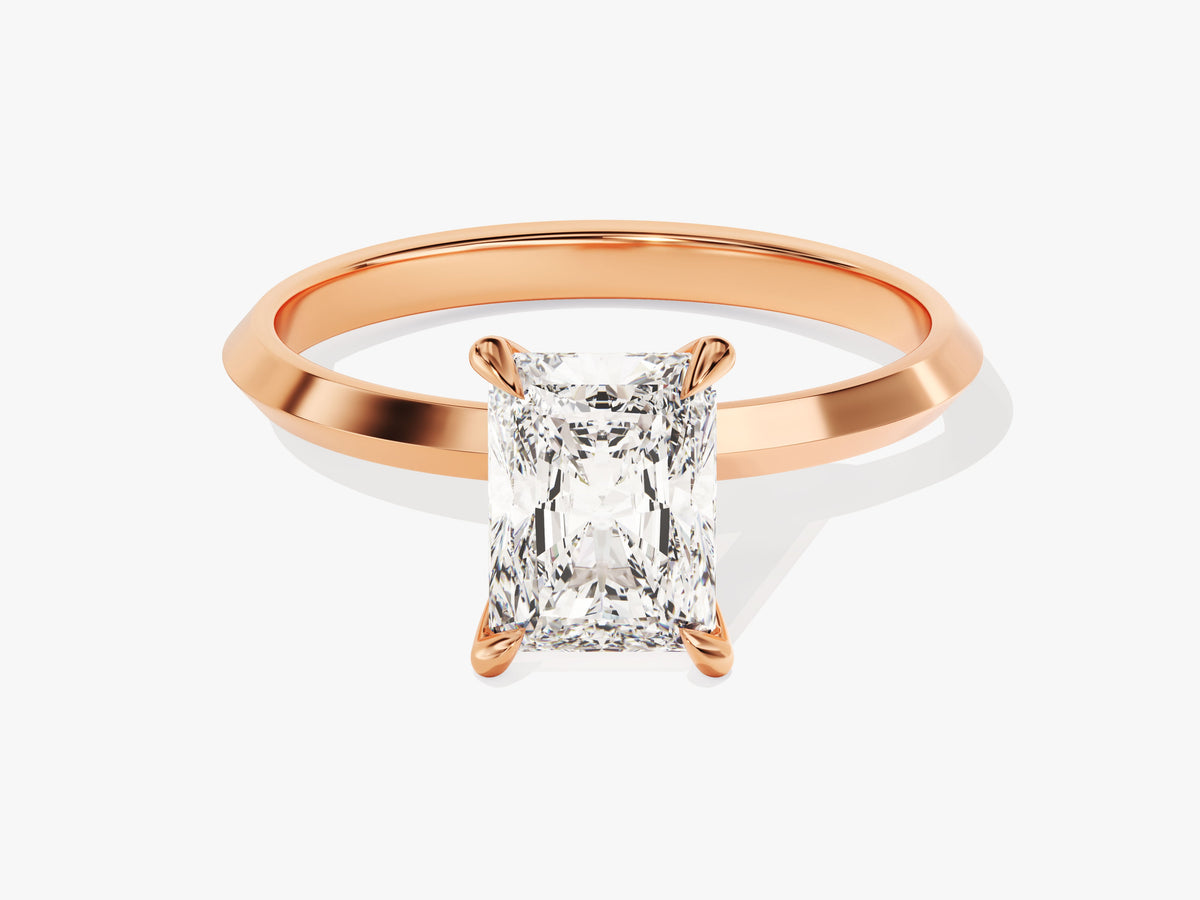 Elevate your proposal with a touch of modern brilliance using our Knife Edge Radiant Moissanite Engagement Ring. This extraordinary ring features a stunning radiant-cut moissanite center stone, celebrated for its timeless charm and radiant brilliance. Yet, the true star of this ring is the knife-edge band, thoughtfully designed to accentuate the ring's modern elegance and unique style.