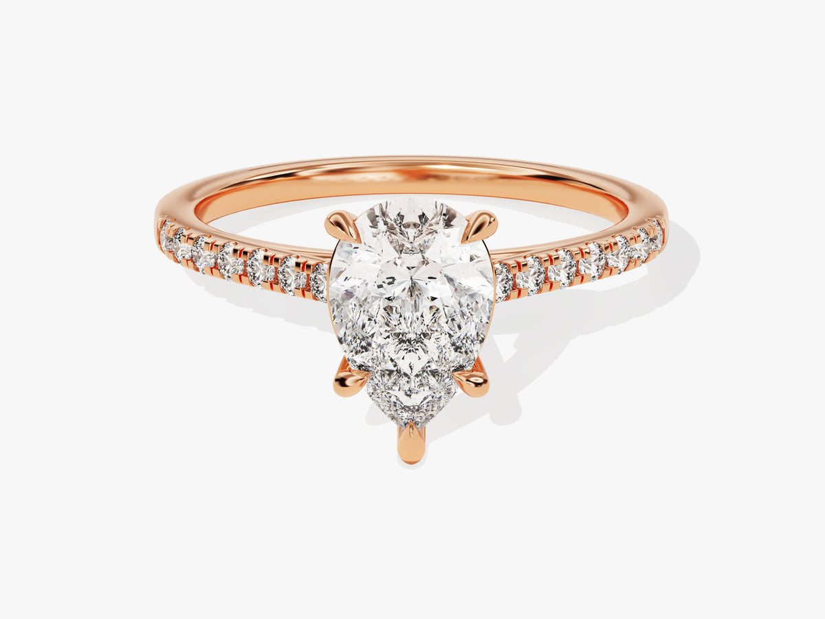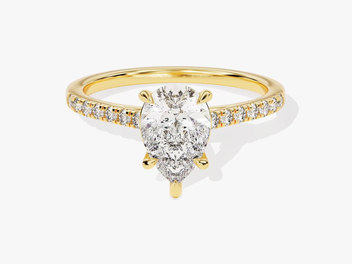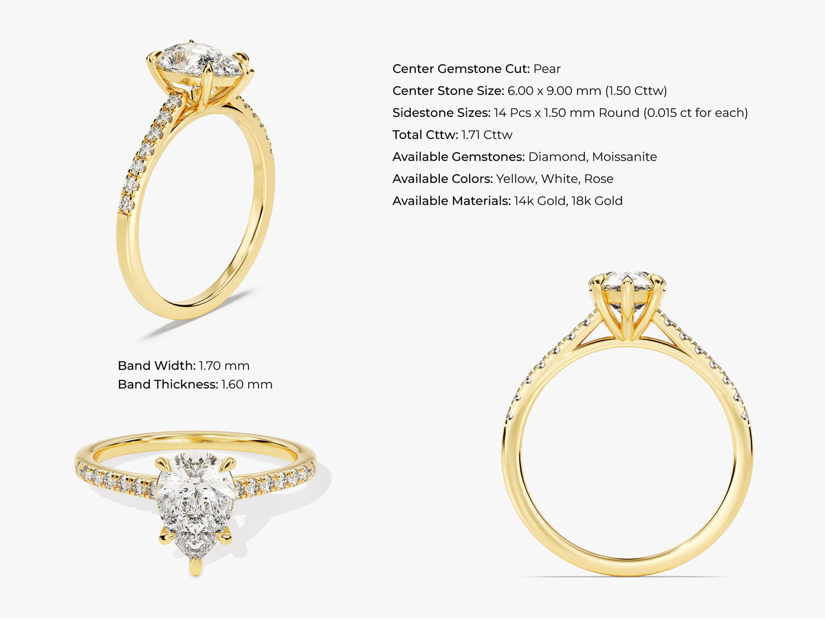 Elevate your love story with the exquisite Pear Cut Moissanite Engagement Ring, embellished with Pave Set Side Stones. This ring is a masterpiece of modern sophistication, featuring a captivating pear-cut moissanite center stone that stands out with its unique elegance. The band is adorned with meticulously set pave stones, adding a touch of glamour and a sprinkle of sparkle.