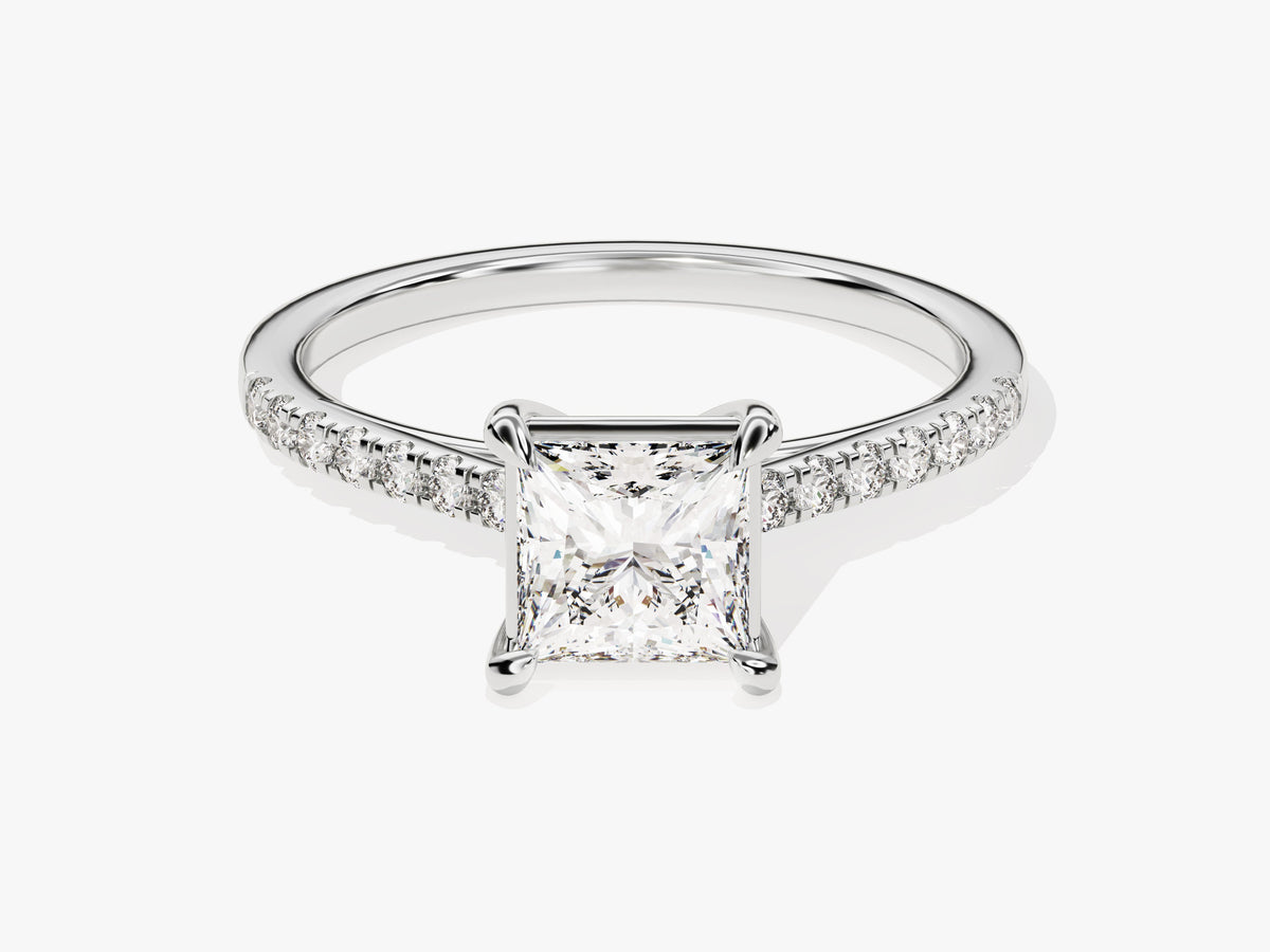 The Princess Cut Moissanite Engagement Ring with Pave Set Side Stones is a dazzling and elegant symbol of love and commitment. This exquisite ring features a brilliant princess-cut moissanite as its centerpiece, celebrated for its square shape and remarkable brilliance. Tiny moissanite stones are meticulously set using the pave technique, creating a sparkling and elegant pathway along the ring's shank.