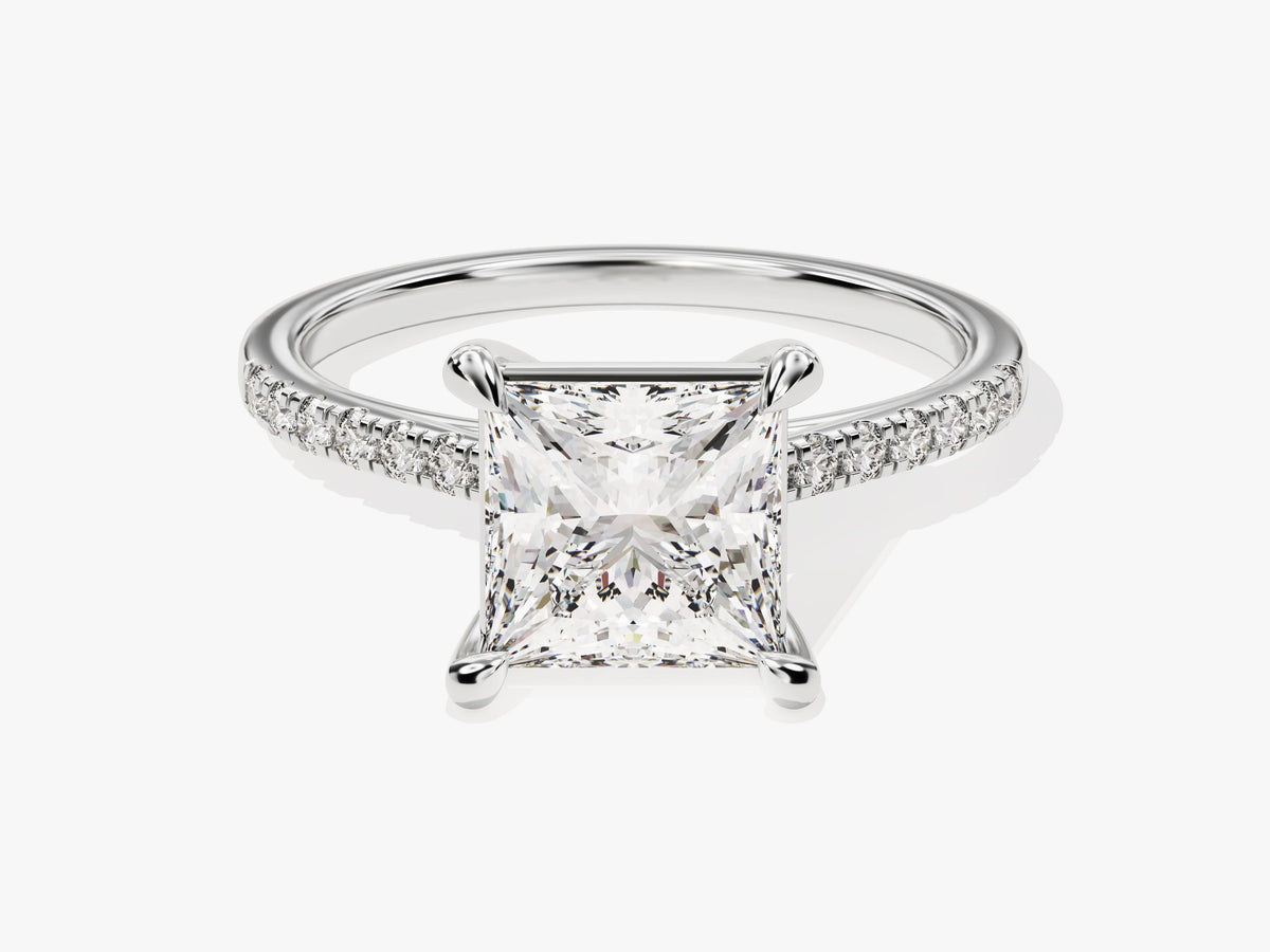 Discover the epitome of romance with our Princess Cut Moissanite Engagement Ring featuring Pave Set Side Stones. This ring is a true work of art, fusing modern elegance with a touch of regal beauty. The centerpiece showcases a dazzling princess-cut moissanite, captivating hearts with its distinctive allure. The band adds to the overall sophistication of the ring, as it's adorned with pave set side stones that twinkle like stars in the night sky, creating a sense of timeless romance.