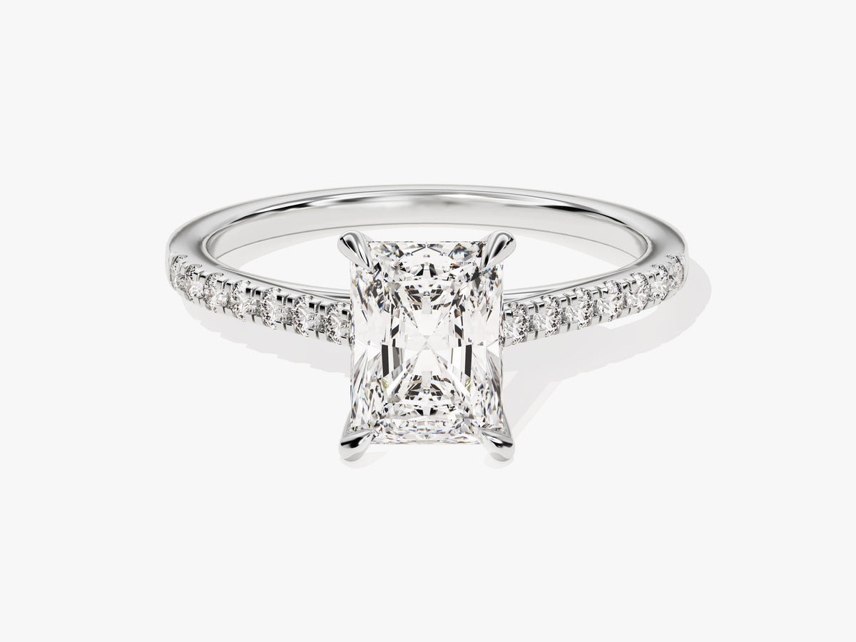 Embark on a journey of pure elegance with our Radiant Cut Moissanite Engagement Ring, elegantly adorned with Pave Set Side Stones. This extraordinary ring is a masterpiece of contemporary sophistication, featuring a radiant-cut moissanite center stone that exudes brilliance and charm. The meticulously paved side stones that adorn the band create a captivating display of sparkle.