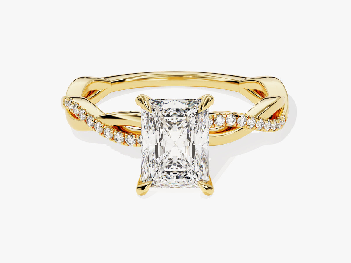 Step into a world of enchantment with our Radiant Twisted Moissanite Engagement Ring, exquisitely embellished with Pave Set Side Stones. This captivating ring effortlessly blends contemporary sophistication with a touch of brilliance and charm, making it a true work of art. The radiant-cut moissanite centerpiece captures hearts with its distinctive allure, and the graceful twist in the band design symbolizes the unique journey of your love.