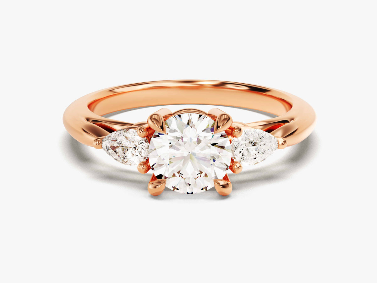 This ring features a 1.00-carat round-cut center stone, surrounded by 1.50-carat pear-shaped side stones. The combined force of their brilliance is simply stunning, making this ring the perfect choice for an engagement ring staple or bride-to-be gift that will stay in style forever.