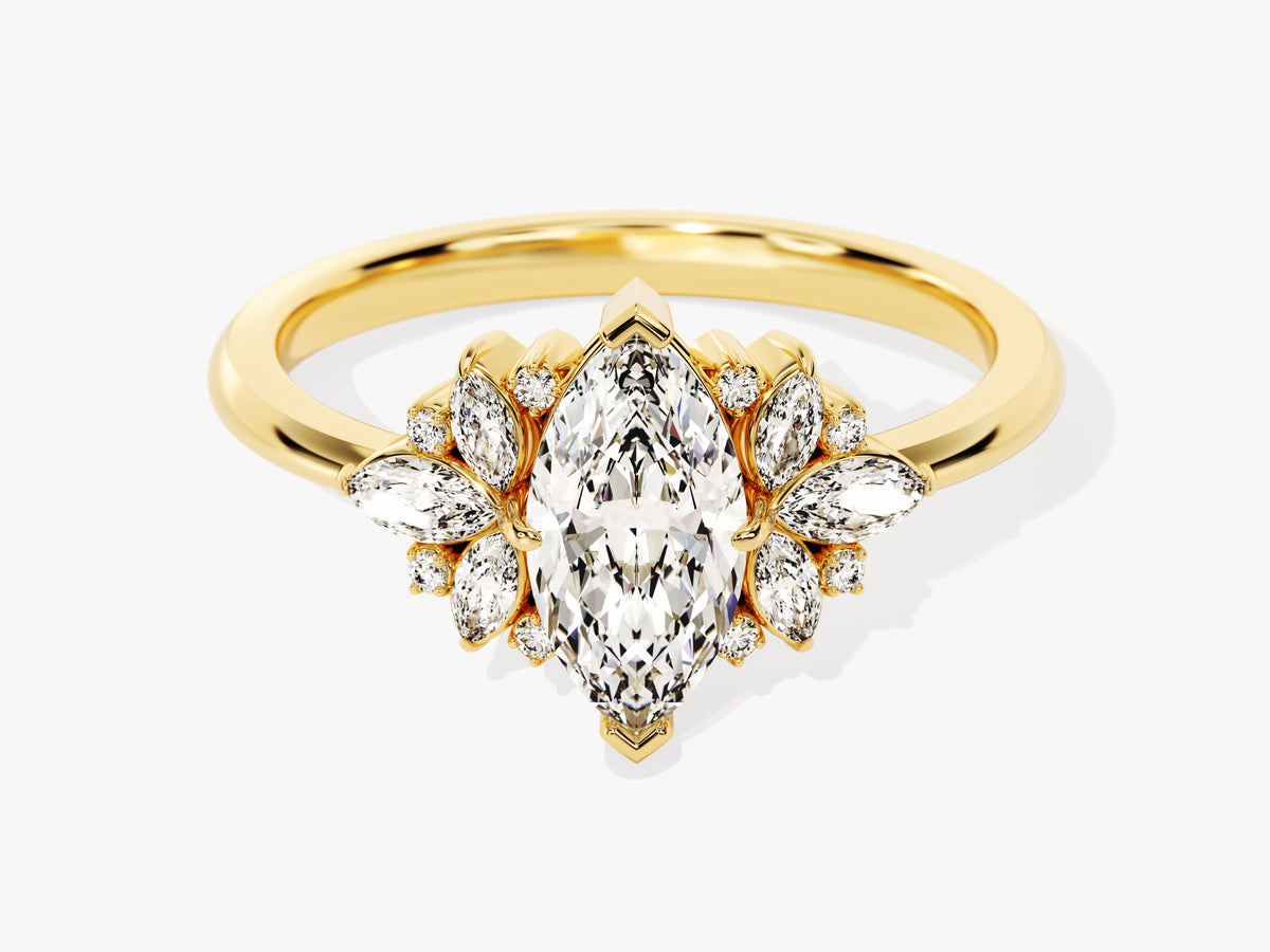 The Vintage Cluster Marquise Cut Moissanite Engagement Ring features a dazzling 1.00 carat marquise cut moissanite as its centerpiece. Surrounding the central stone are smaller moissanite gems arranged in a cluster formation reminiscent of vintage styles.